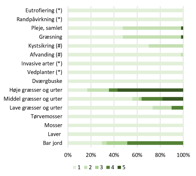 Fordelingen af strukturindikatorerne for den seneste kortlægning er vist i Figur 1320.103. Det ses, at ugræssede strandenge med en højtvoksende græs- og urtevegetation udgør omtrent to tredjedele af det kortlagte areal, mens græssede rørsumpe med lav vegetation udgør ganske få procent af arealet. Endelig er der en relativt høj dækning af blottede flader, hvilket peger på at en del af vadegræssamfundet er i et tidligt successionsstadium med en mere åben vegetation. Vedplanter er naturligt fraværende i vadegræssamfundet. Der er ikke registreret invasive plantearter (se også afsnit om artssammensætning). Der er ikke registreret tydelig eutrofiering fra direkte gødskning og tilskudsfodring samt randpåvirkninger fra tilstødende marker, ligesom der kun er registreret afvanding eller kystsikring på ganske få lokaliteter. Omfanget af historisk og nutidig næringsstofbelastning, betydningen af begrænsninger i den naturlige kystdynamik og effekterne af afvanding og vandindvinding på de hydrologiske forhold er vanskeligt at vurdere og i særdeleshed, når vurderingerne skal gøres i felten og på luftfotos samt på den skala kortlægningen foretages på. Vurderingerne af effekterne på habitattyperne vil derfor være forbundet med stor usikkerhed og vil sandsynligvis være underestimeret. Vurdering af tilgroning er lettere at foretage og dokumentere i felten baseret på ophobet plantemateriale og kolonisering af buske og træer.